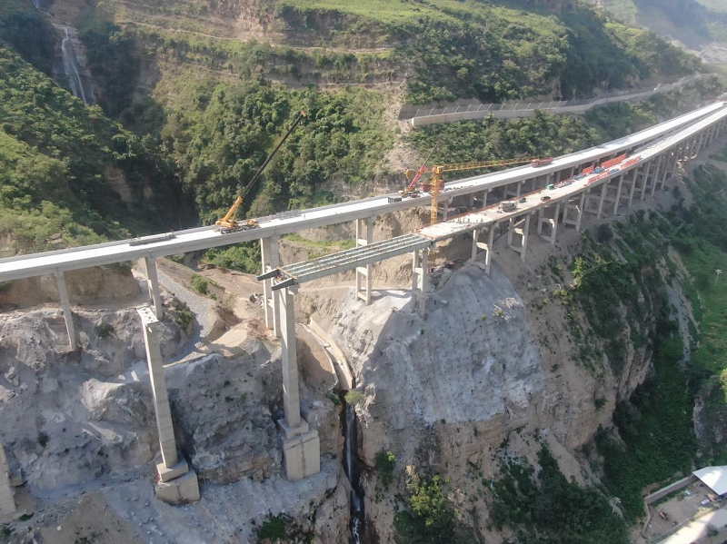 罗家坪左线特大桥55m钢梁采用四片主梁结构,梁高2.3m,钢主梁中心间距3.2m,横向采用10道钢横梁连接,总重约250吨,为跨越冲沟而设。桥梁施工位置地形复杂,机械作业难度大,安全风险高,沿江高速金宁段ZCB1-8项目为保证工期进度,克服地形条件限制,经综合方案比选,首次采用梁上顶推施工,施工中通过验算分析各点位受力状态,采取强化梁体连接质量、实时监控顶推线形、严控每循环精准定位及动态纠偏等措施,有效解决了现场施工纵坡大、曲线顶推精度高及落梁高度大等难题,同时针对现场施工组织难度大、安全风险高问题,项目领导班子积极深入一线管理,重点落实各关键环节,圆满完成钢板梁架设安装施工。